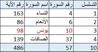 والعجيب أن آية تسمية سورة يونس هي الأية 98 و هي كلمة يونس الوحيدة في سورة يونس