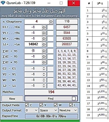 سنبحث عن مجموعات رباعية من السور القرءانية بحيث يكون مجموع حروف السور الأربعة = 14842 (مجموع قوى اول 19 عدد لمرسين)